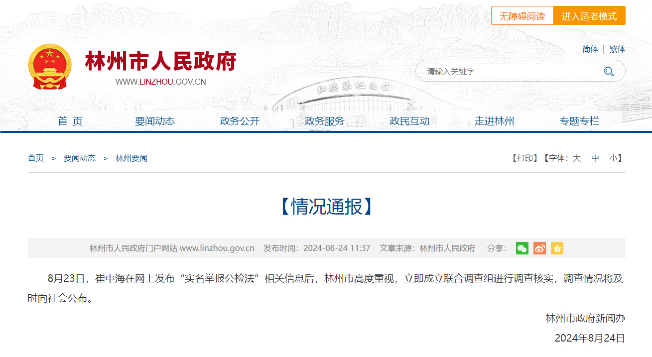 河南林州市通报“崔中海实名举报公检法”:成立联合调查组