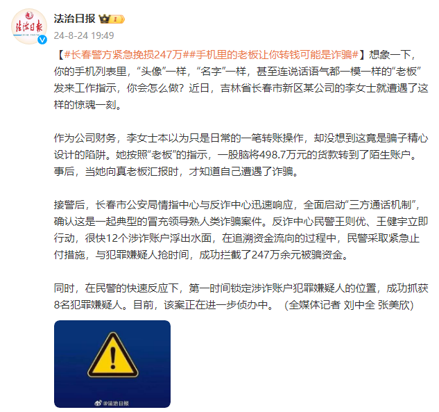 想象一下,你的手机列表里,“头像”一样,“名字”一样,甚至连说话语气都一模一样的“老板”发来工作指示,你会怎么做?近日,吉林省长春市新区某公司的李女士就遭遇了这样的惊魂一刻。