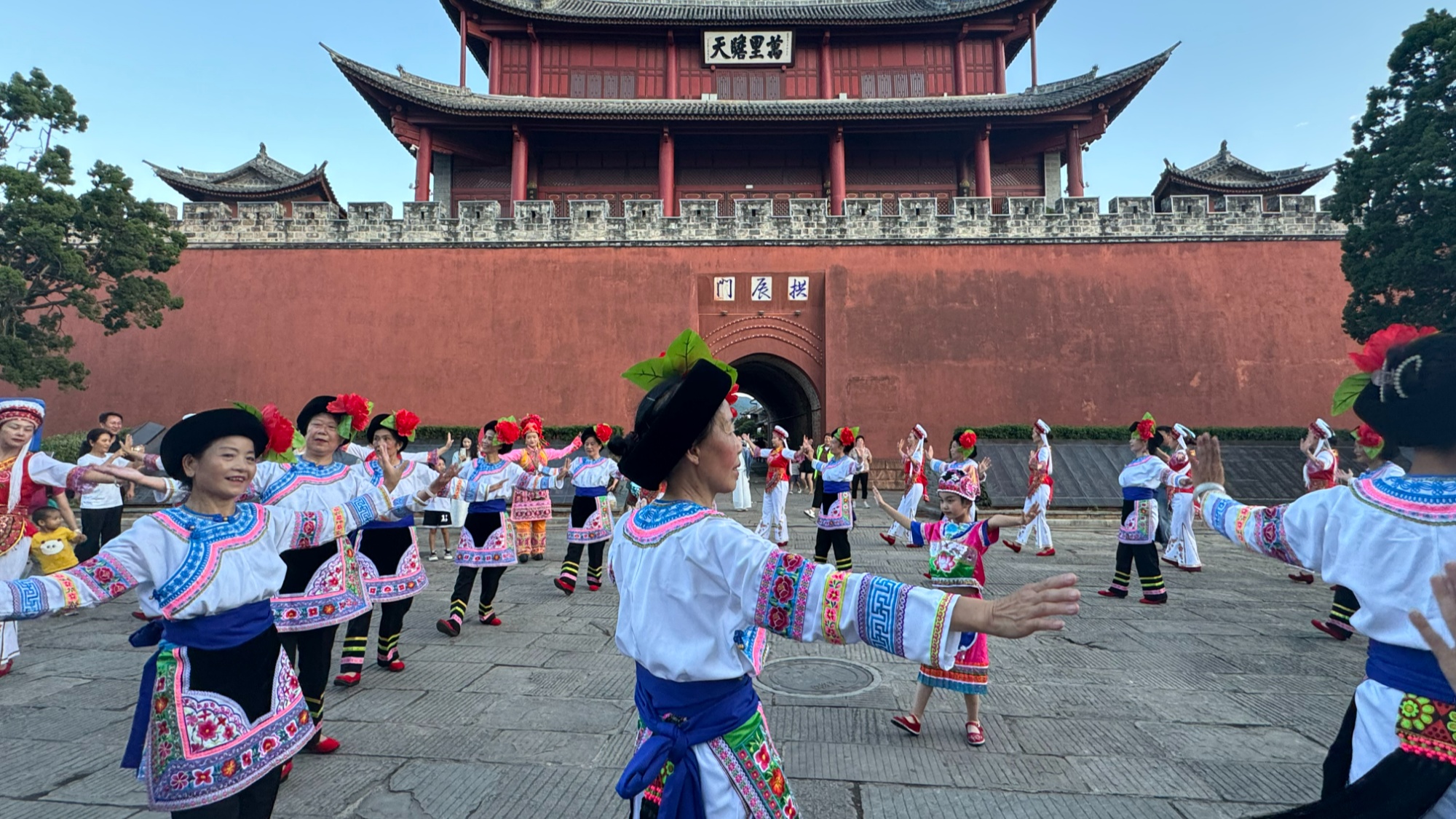 在巍山古城拱辰楼广场,经常有“法治汇演”在这里上演。昨天,巍山的几只民族文艺队表演了《白族霸王鞭》舞蹈、《平安巍山》快板、《是你》声乐、《阿克哩哈》舞蹈等节目,巧妙地将普法内容融入到其中,以歌舞传递法治的力量,群众载歌载舞,现场氛围浓烈。