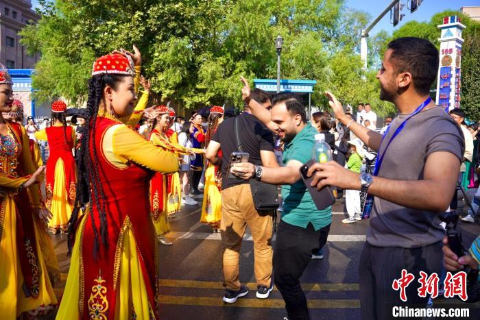 伊犁哈萨克自治州是多民族聚居区,拥有47个不同民族。仅在伊宁市喀赞其民族风情街,就居住着维吾尔族、哈萨克族、回族等13个不同民族的民众。当日,巴基斯坦媒体和智库人士来到喀赞其街道,他们在街边观看民族舞蹈表演,还邂逅了一场维吾尔族婚礼。