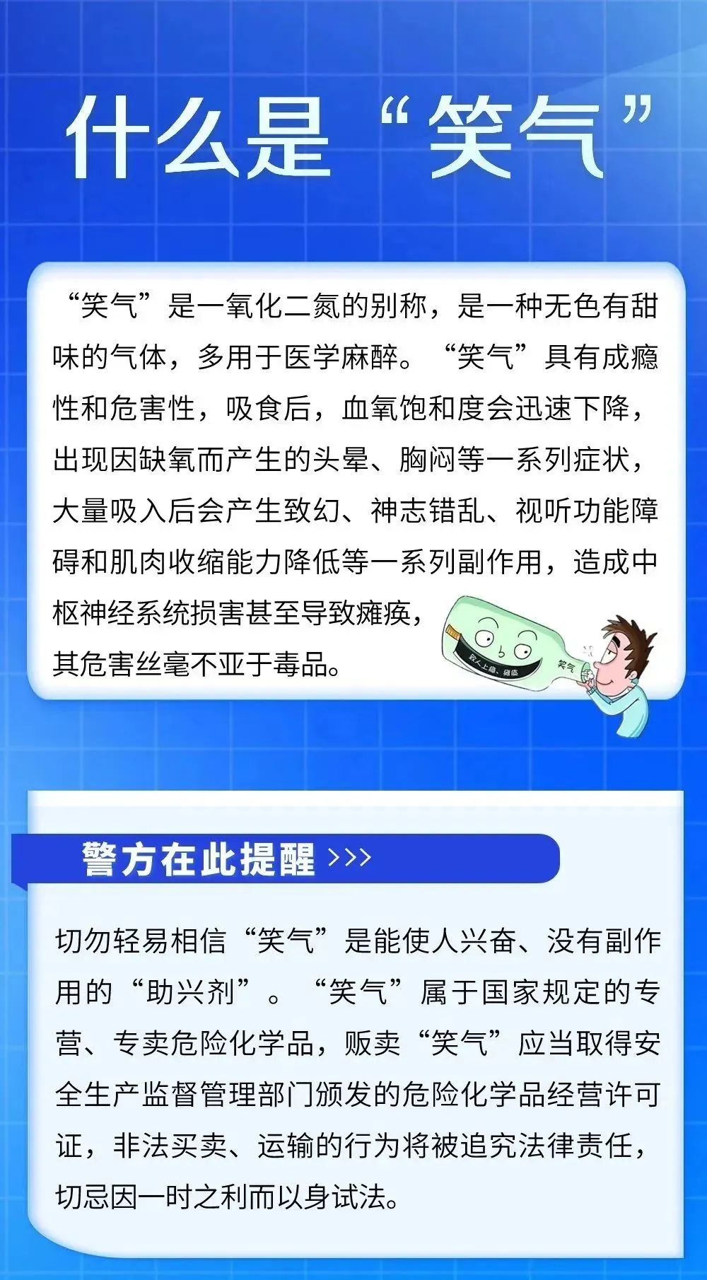 日前,沈阳警方破获一起非法经营“笑气”(一氧化二氮)案件,抓获涉案人员51人,查获“笑气”2000余升,涉案金额30余万元。