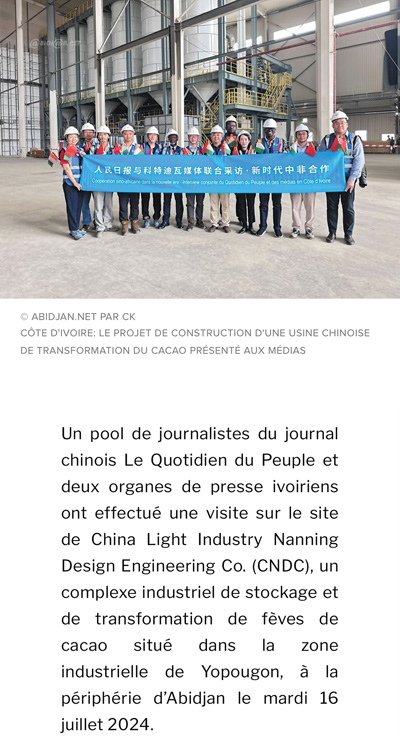 7月16日,人民日报与两家科特迪瓦新闻机构记者一行参观了由中国轻工业南宁设计工程有限公司总承包的可可加工及可可豆仓库建设项目,该项目坐落在阿比让郊区的约普贡工业区。