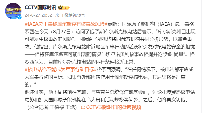 国际原子能机构(IAEA)总干事格罗西在今天(8月27日)访问了俄罗斯库尔斯克核电站后表示,“库尔斯克州已出现可能发生核事故的风险”。国际原子能机构将同俄方机构共同分析形势,以避免事故。他指出,库尔斯克核电站附近地区军事行动的活跃将引发对核电站安全的担忧——但将在库尔斯克可能出现的情况与切尔诺贝利核事故相提并论“为时尚早”。格罗西认为,目前库尔斯克核电站的运行条件接近正常。