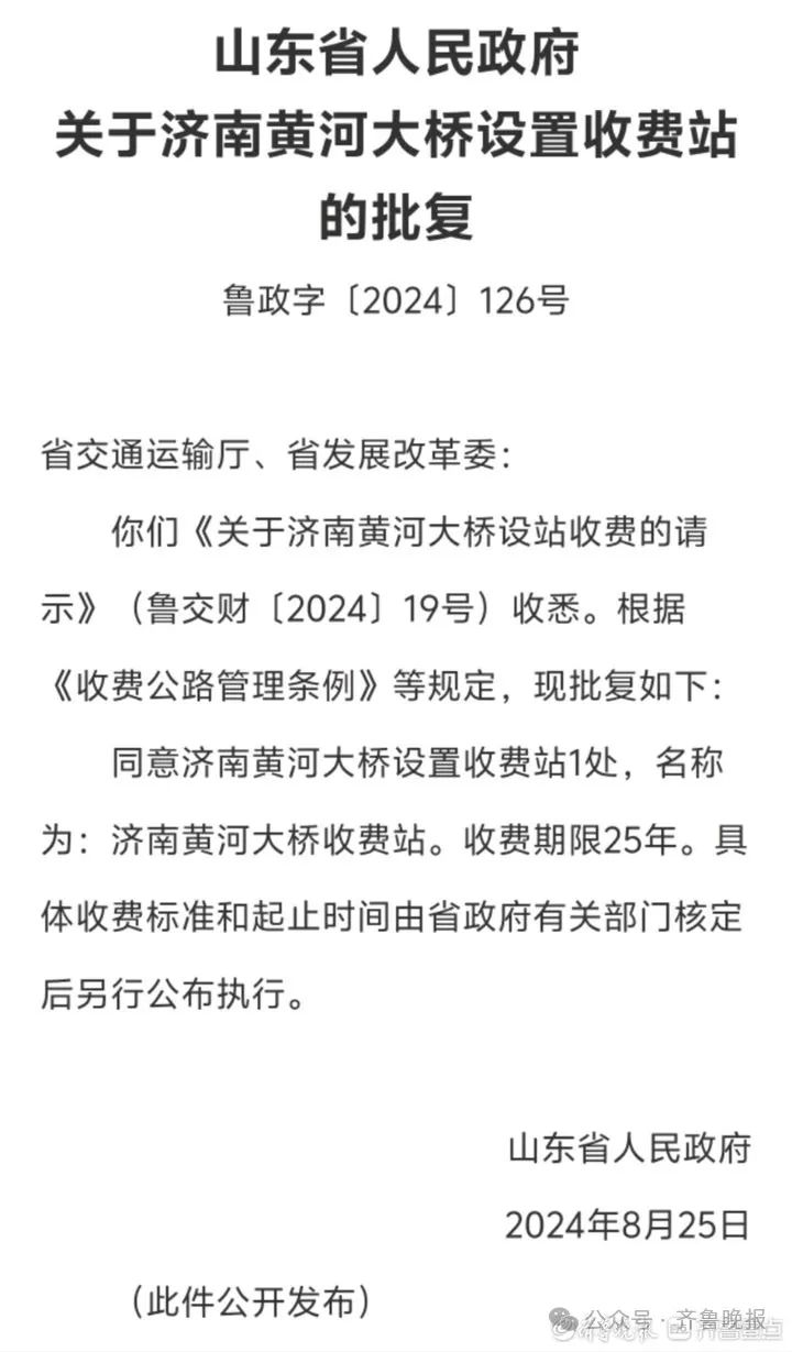 26日,山东省人民政府公示《关于济南黄河大桥设置收费站的批复》,同意济南黄河大桥设置收费站1处,名称为济南黄河大桥收费站,收费期限25年。该《批复》公示后,很快在社交媒体传播,并引起广泛讨论:济南黄河大桥1982年7月建成通车,1985年4月开始征收车辆通行费,2017年11月终止收费,收费站也已拆除;现如今,黄河大桥又要开始重新收费吗?