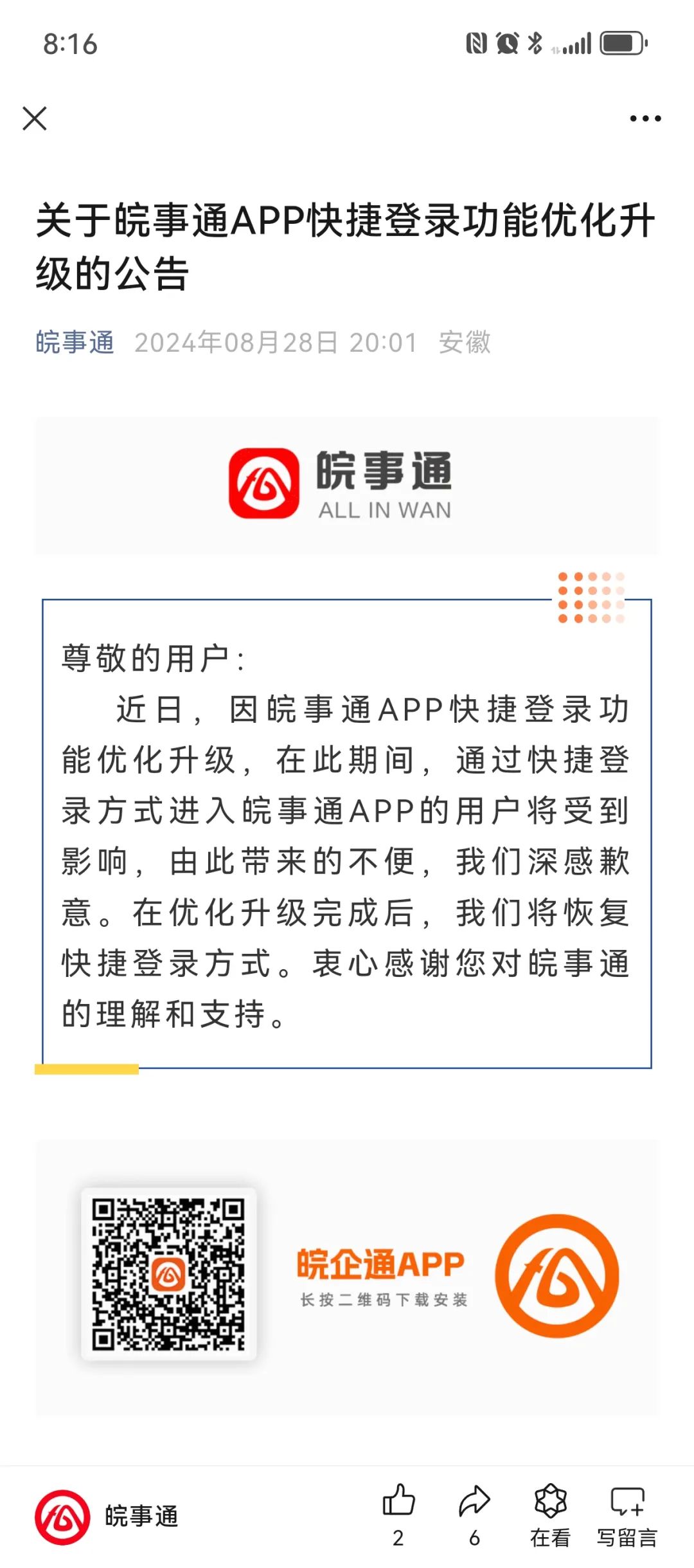 8月28日,有媒体报道安徽政务服务App“皖事通”取消支付宝登录渠道的信息。记者刚刚从皖事通官方公众号了解到,近日,皖事通app对包含支付宝在内的“快捷登录”方式优化升级,在优化升级完成后将恢复快捷登录方式,并非取消支付宝登录渠道。