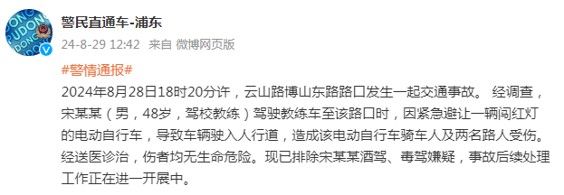 2024年8月28日18时20分许,云山路博山东路路口发生一起交通事故。 经调查,宋某某(男,48岁,驾校教练)驾驶教练车至该路口时,因紧急避让一辆闯红灯的电动自行车,导致车辆驶入人行道,造成该电动自行车骑车人及两名路人受伤。经送医诊治,伤者均无生命危险。现已排除宋某某酒驾、毒驾嫌疑,事故后续处理工作正在进一步开展中。