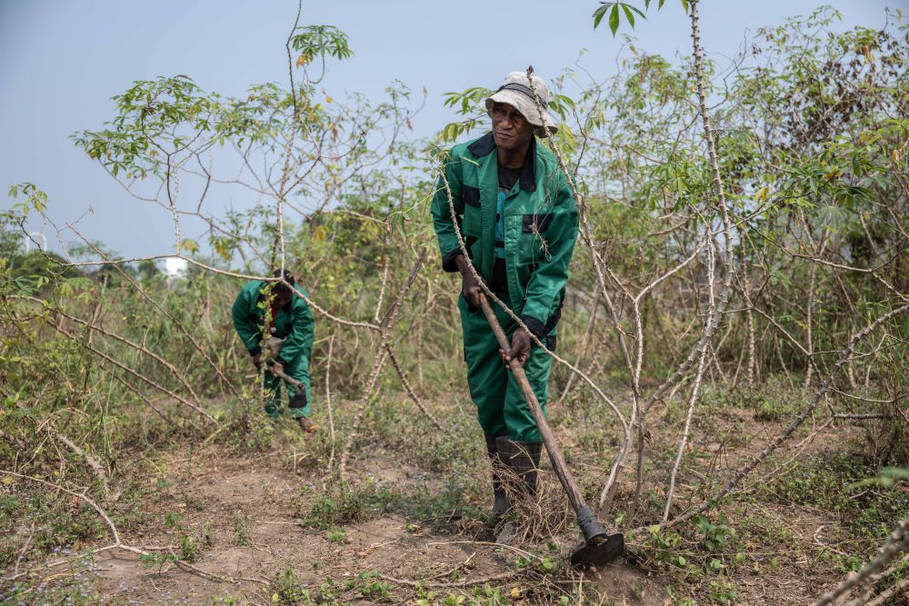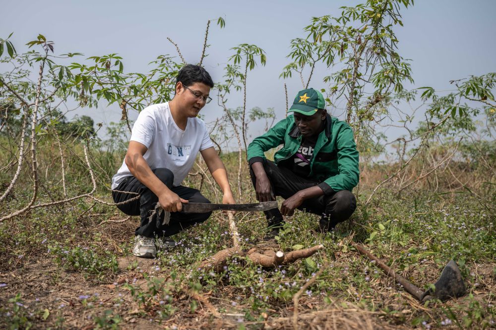 ↑在刚果(布)首都布拉柴维尔的中国援刚果(布)农业技术示范中心内,中方农业专家李科明与当地员工一起收获木薯。