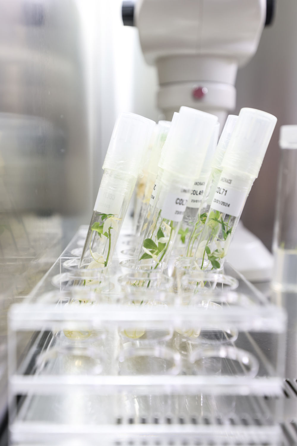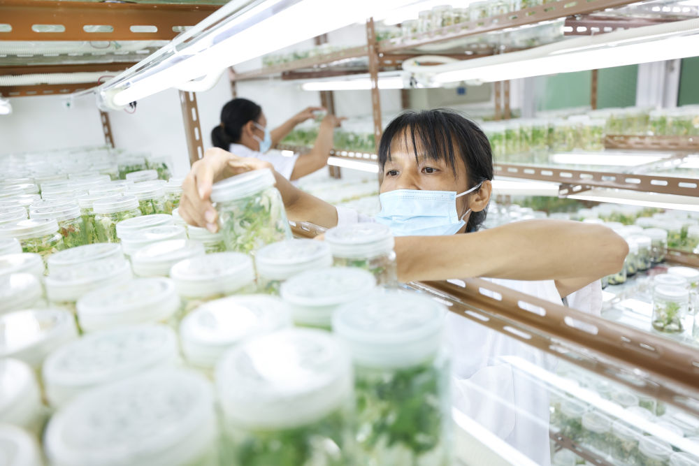 ↑中国热带农业科学院的科研人员在实验室做木薯组培工作。