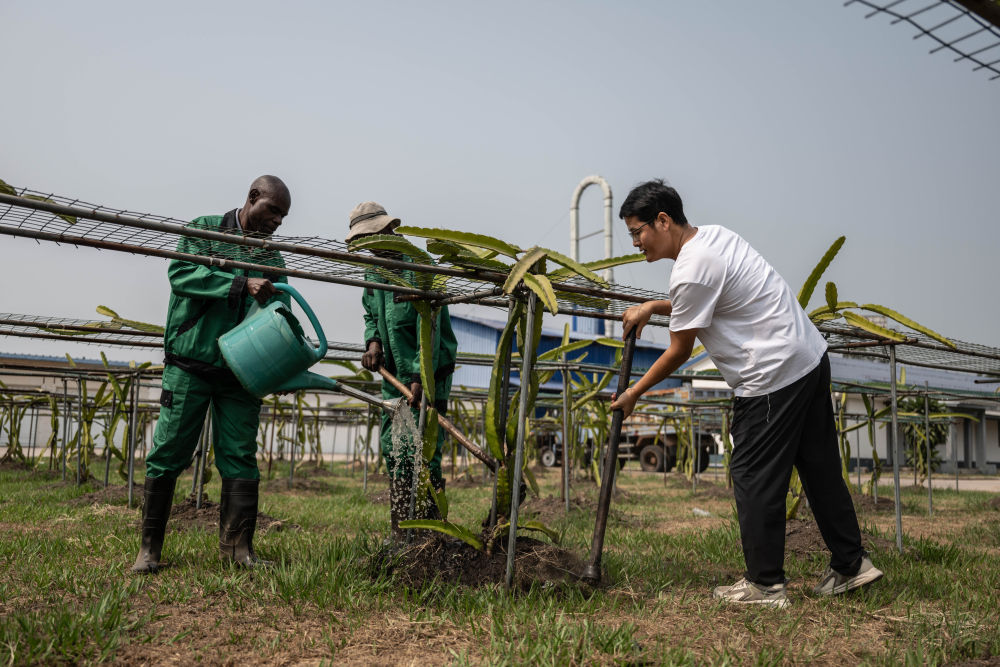 ↑在刚果(布)首都布拉柴维尔的中国援刚果(布)农业技术示范中心内,中方农业专家李科明与当地员工在为火龙果浇水、松土。