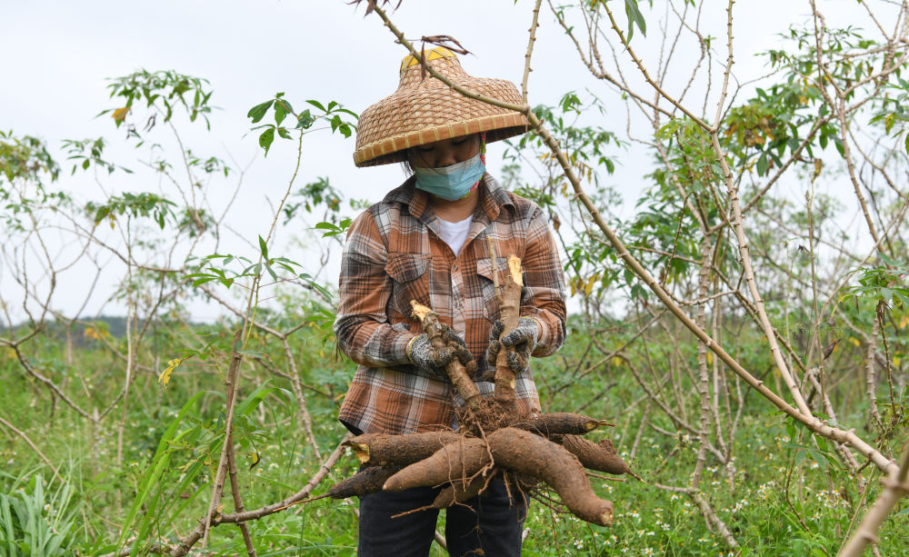 ↑工作人员在位于海南儋州的国家木薯种质资源圃收获木薯。