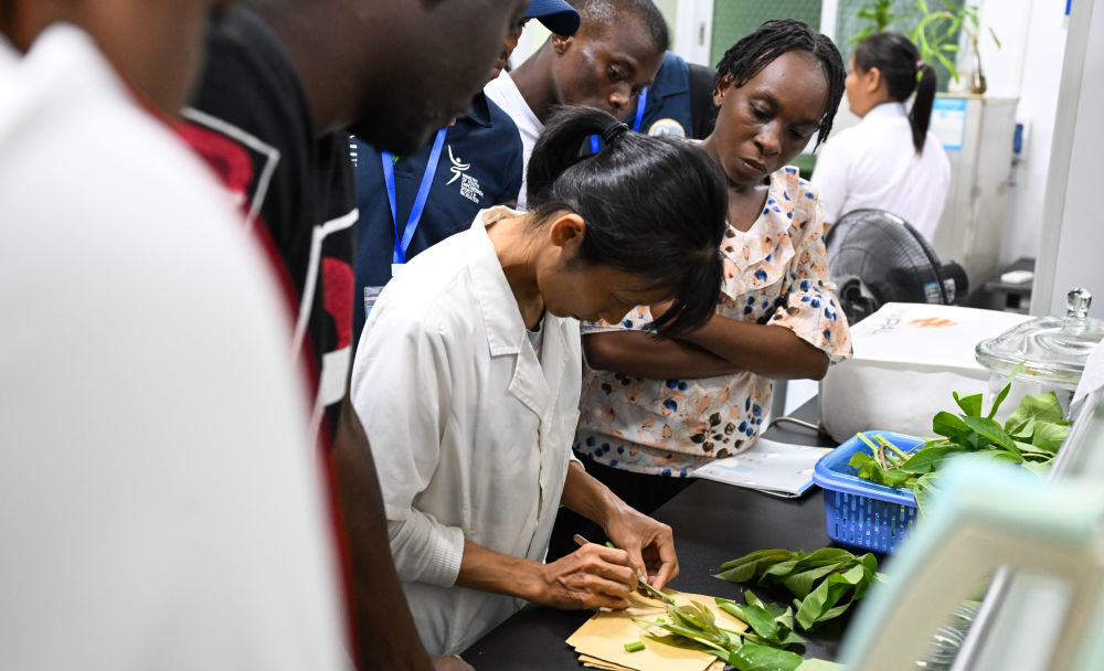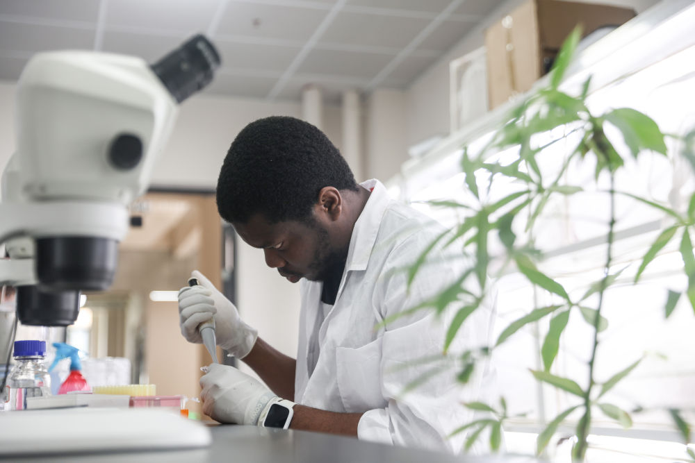 ↑尼日利亚留学生格雷戈里在中国热带农业科学院三亚研究院做木薯虫害绿色防控研究实验。