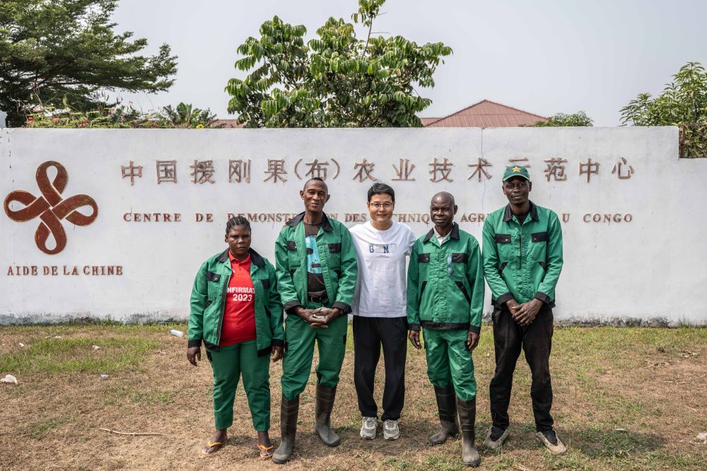 ↑在刚果(布)首都布拉柴维尔的中国援刚果(布)农业技术示范中心外,中方农业专家李科明与当地员工合影。