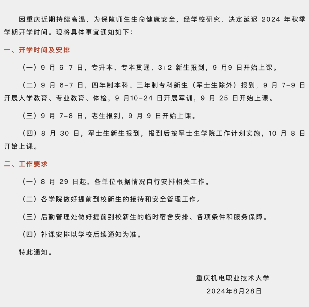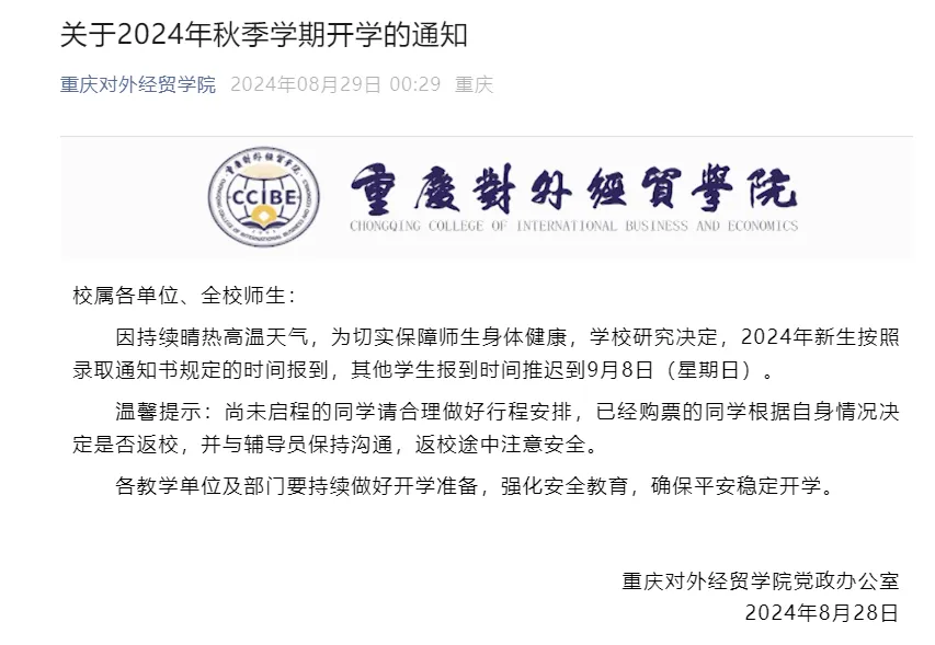 8月28日至29日,因持续高温,重庆交通大学、重庆工程学院、重庆对外经贸学院、重庆外语外事学院、重庆电力高等专科学校、重庆城市管理职业学院、重庆工贸职业技术学院、重庆科创职业学院、重庆航天职业技术学院、重庆商务职业学院、重庆机电职业技术大学、重庆文化艺术职业学院、重庆交通职业学院等多所高校陆续发布延迟开学通知。