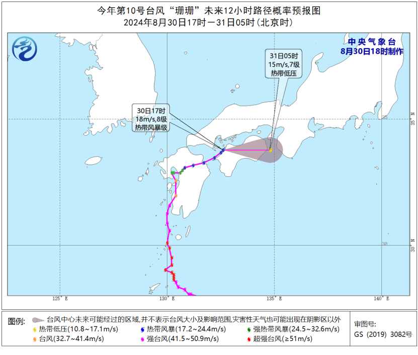 今年第10号台风“珊珊”(热带风暴级)的中心今天(30日)下午5点钟位于日本濑户内海,就是北纬33.8度、东经132.6度,中心附近最大风力有8级(18米/秒),中心最低气压为995百帕。