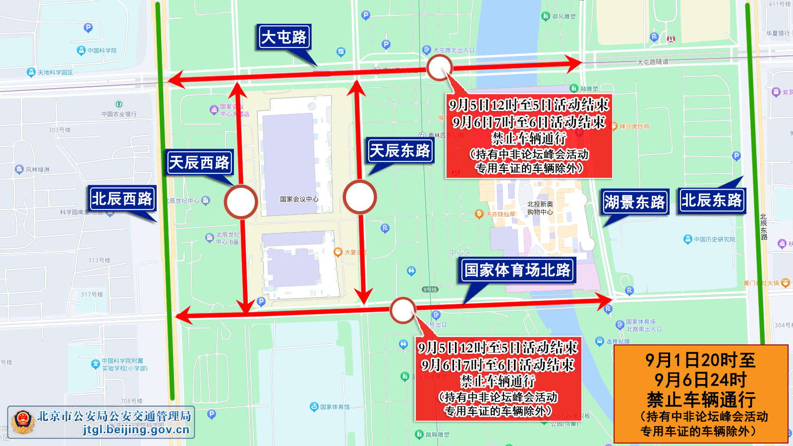(一)9月1日20时至9月6日24时,天辰东路由国家体育场北路与天辰东路交叉口(不含)至大屯路与天辰东路交叉口(不含)南北双方向、天辰西路由国家体育场北路与天辰西路交叉口(不含)至大屯路与天辰西路交叉口(不含)南北双方向,禁止车辆通行。车辆可经北辰东路、北辰西路绕行。