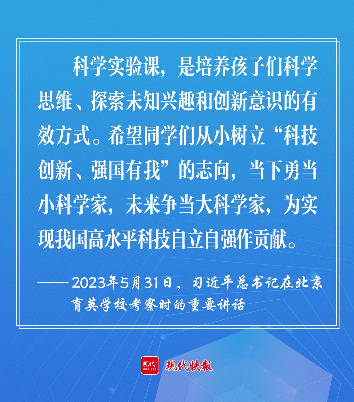 2023年5月,习近平总书记在北京育英学校考察时强调,希望同学们从小树立“科技创新、强国有我”的志向,当下勇当小科学家,未来争当大科学家,为实现我国高水平科技自立自强作贡献。