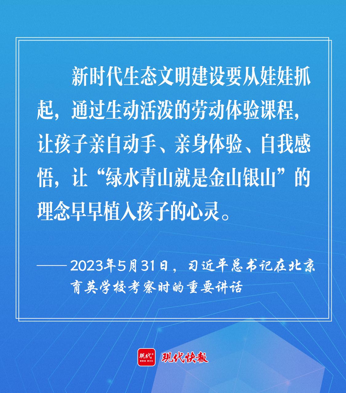 2023年5月,习近平总书记在北京育英学校考察时强调,新时代生态文明建设要从娃娃抓起,通过生动活泼的劳动体验课程,让孩子亲自动手、亲身体验、自我感悟,让“绿水青山就是金山银山”的理念早早植入孩子的心灵。