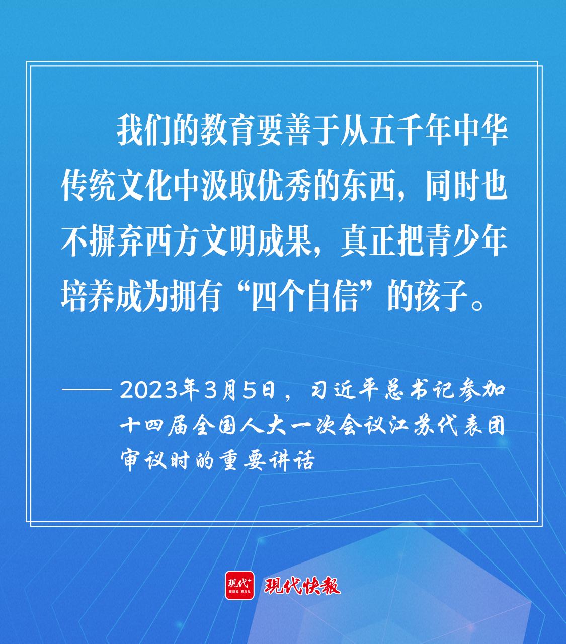 2023年3月5日,习近平总书记参加十四届全国人大一次会议江苏代表团审议时,勉励教育工作者“要善于从五千年中华传统文化中汲取优秀的东西,同时也不摒弃西方文明成果,真正把青少年培养成为拥有‘四个自信’的孩子。”