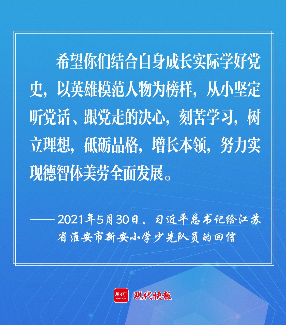 2021年5月30日,习近平总书记给江苏省淮安市新安小学少先队员回信时强调,“希望你们结合自身成长实际学好党史,以英雄模范人物为榜样,从小坚定听党话、跟党走的决心,刻苦学习,树立理想,砥砺品格,增长本领,努力实现德智体美劳全面发展。”