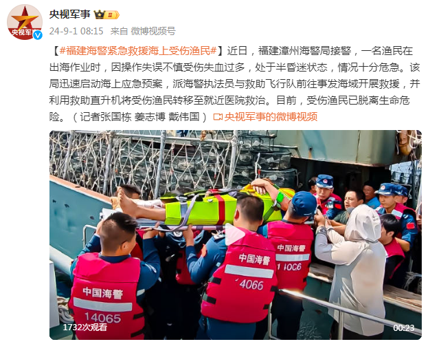 近日,福建漳州海警局接警,一名渔民在出海作业时,因操作失误不慎受伤失血过多,处于半昏迷状态,情况十分危急。该局迅速启动海上应急预案,派海警执法员与救助飞行队前往事发海域开展救援,并利用救助直升机将受伤渔民转移至就近医院救治。目前,受伤渔民已脱离生命危险。(记者张国栋 姜志博 戴伟国)