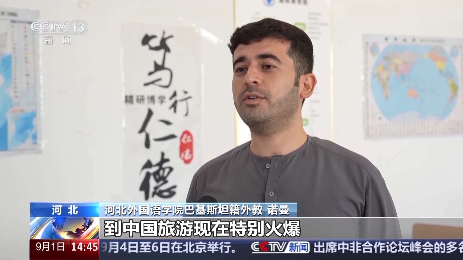 河北外国语学院巴基斯坦籍外教 诺曼:到中国旅游现在特别火爆,包括巴基斯坦在内,许多国家的人都来到中国,爱上了中国的美食和文化,感受这里各种便捷舒适的生活方式,我身边还有很多留学生朋友都很享受在这里的学习生活。
