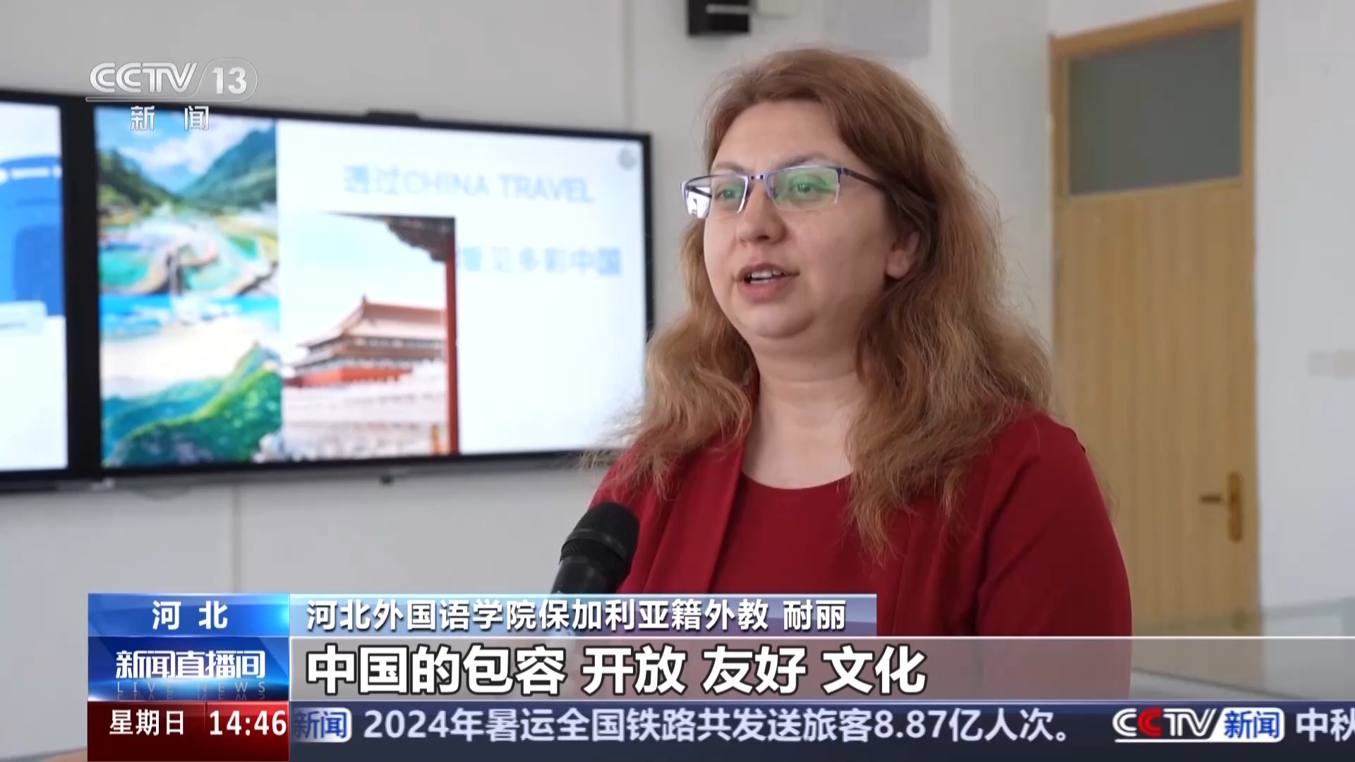 河北外国语学院保加利亚籍外教 耐丽:我是9年之前来到中国的,中国的包容、开放、友好、文化让我非常喜欢在这里,我在这里也一直看着中国的变化和发展,我希望跟更多人分享我在这里感受到的多彩的中国。
