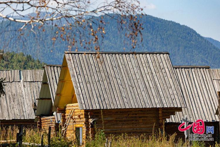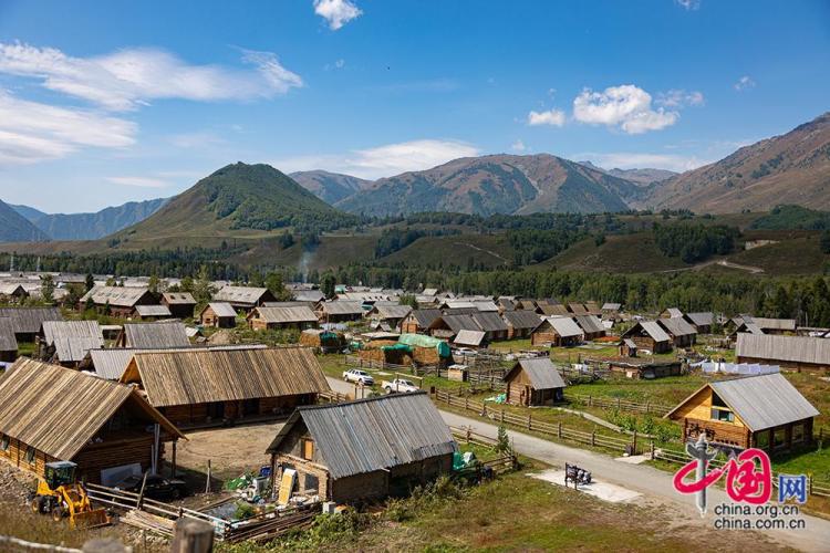 8月28日,在新疆阿勒泰地区布尔津县禾木村,一栋栋小木屋被群山环绕。中国网记者 伦晓璇 摄