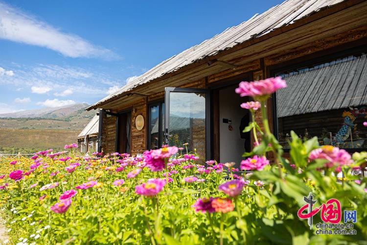 8月28日,在新疆阿勒泰地区布尔津县禾木村一家民宿,盛开的鲜花映衬在蓝天白云之下。中国网记者 伦晓璇 摄