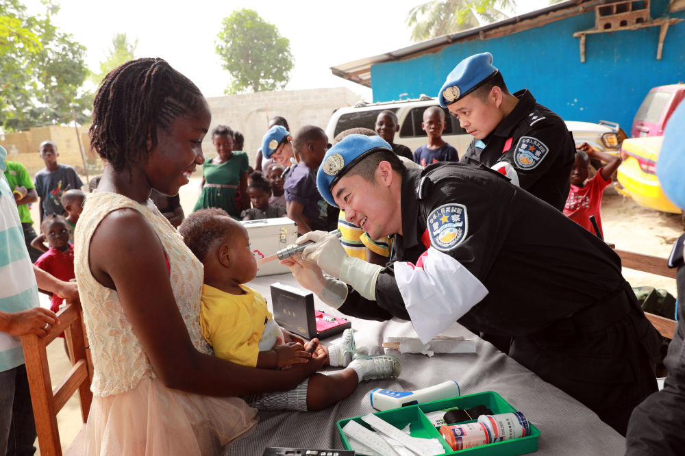 2017年12月28日,在利比里亚蒙罗维亚,中国维和警察防暴队医疗人员为儿童做口腔检查。