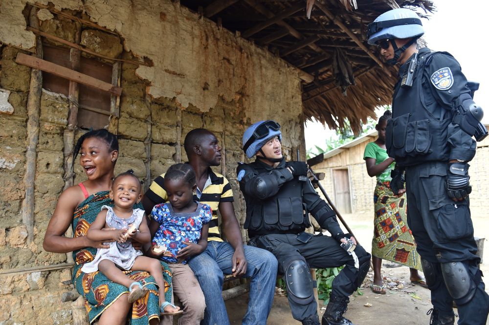 2015年11月3日,在利比里亚格林维尔一座村庄,中国维和警察防暴队队员询问近期治安等情况。
