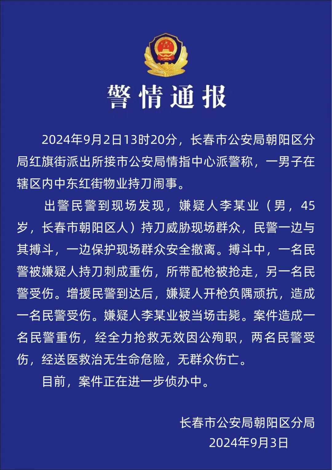 长春警方通报“一男子持刀闹事”:一名民警因公殉职,两名民警受伤,嫌疑人被当场击毙