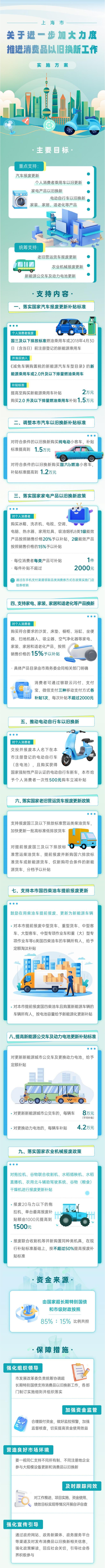 根据《国家发展改革委 财政部关于加力支持大规模设备更新和消费品以旧换新的若干措施》,9月3日,上海印发《上海市关于进一步加大力度推进消费品以旧换新工作实施方案》。《实施方案》按照“增规模、提标准、扩范围、优流程”的总体思路,重点支持汽车报废更新,个人消费者乘用车置换更新,家电产品、电动自行车以旧换新,旧房装修、厨卫等局部改造、居家适老化改造所用物品和材料购置,促进智能家居消费等;统筹支持老旧营运货车报废更新、农业机械报废更新提标、新能源公交车及动力电池更新提标等。