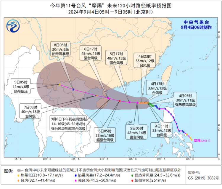 大风预报:9月4日08时至5日08时,台湾海峡东部、南海大部、巴士海峡、福建南部沿海、广东东部沿海将有6-8级风,其中南海东北部部分海域风力可达9-11级,“摩羯”中心经过的附近海域风力可达12-14级、阵风15-16级。