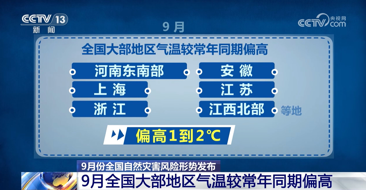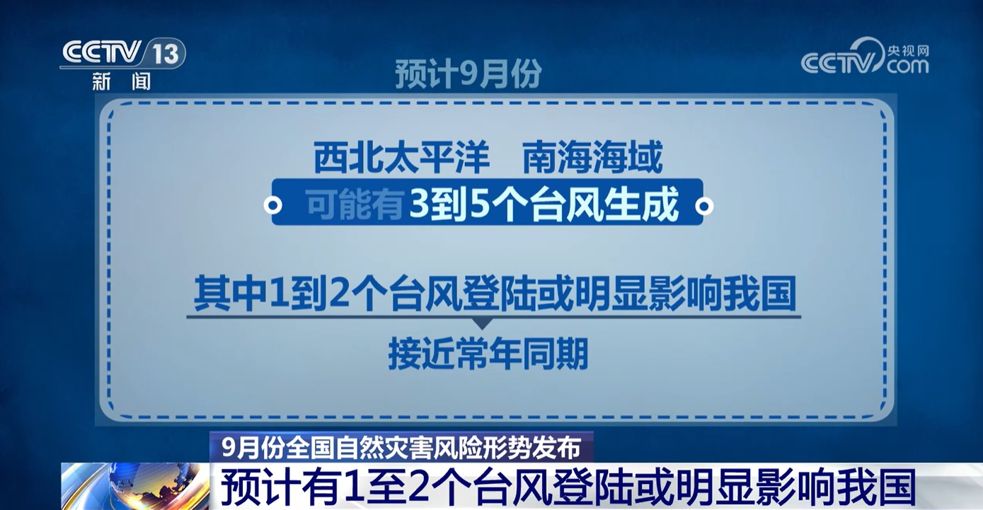 央视网消息: 近日,国家防灾减灾救灾委员会办公室、应急管理部会同自然资源部等部门对9月份全国自然灾害风险形势进行会商研判。分析认为,9月,华西秋雨进入集中期,东北、华北、华东、华南等地局地存在洪涝灾害风险,部分河流可能发生超警洪水。有1到2个台风登陆或明显影响华南沿海地区。