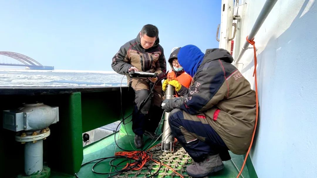 哈尔滨工程大学水声通信与定位技术创新团队在冰上做实验。