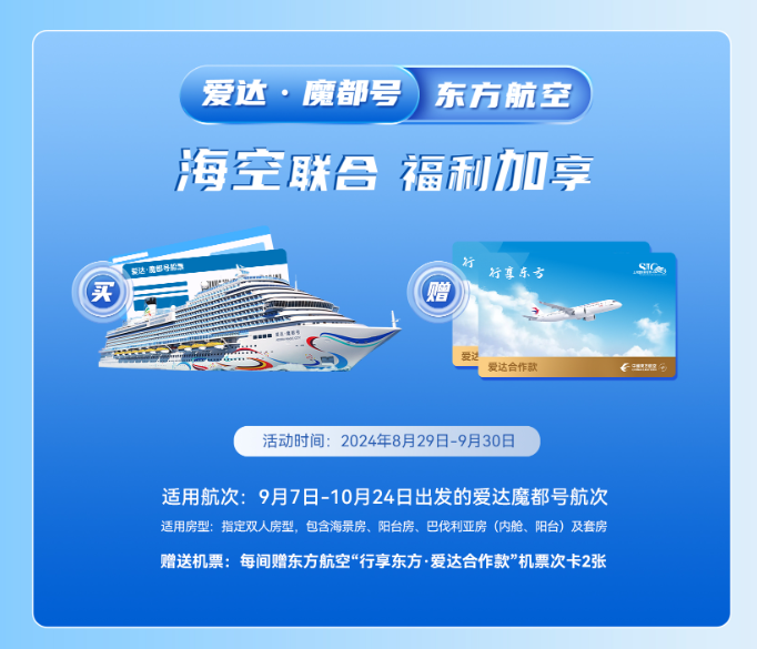 9月30日以前,消费者通过爱达邮轮官网、小程序或客服中心购买爱达·魔都号9月7日至10月24日期间航次的指定舱房,每间将获赠“行享东方·爱达联合款”机票次卡2张。活动适用房型指定为双人房型(普通内舱除外),包含海景房、阳台房、巴伐利亚房内舱、巴伐利亚阳台房以及套房。