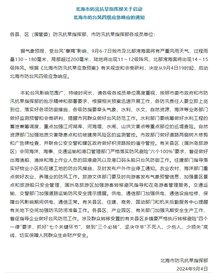 北海市启动防台风四级应急响应