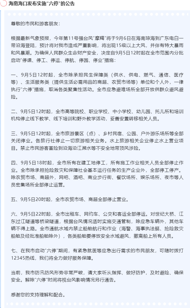 为保障旅客安全,征得海南省交通运输厅意见后,海南海汽集团决定自9月5日凌晨起,暂停所有海汽系统客运站的跨市县客运服务。