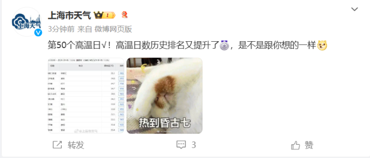 9月5日13时20分,上海徐家汇站气温达35.1℃。这是上海今年第50个高温日。@上海市天气 图