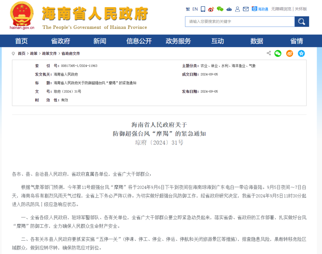 海南发布紧急通知