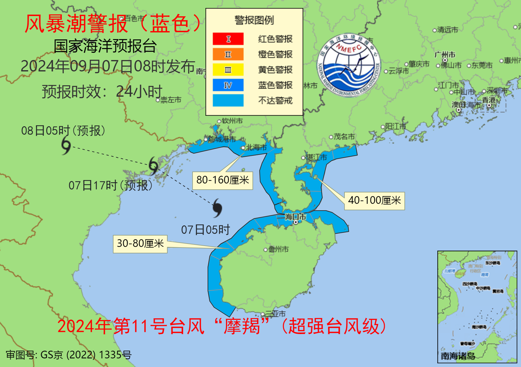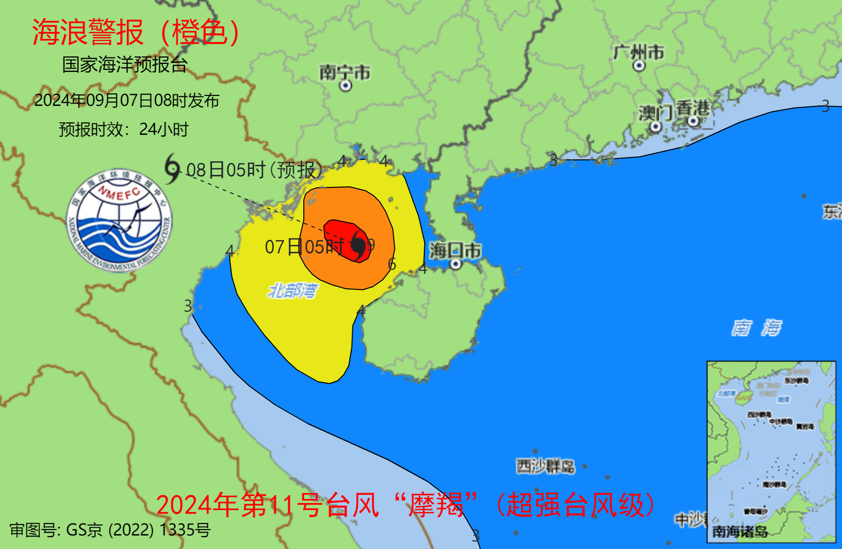 国家海洋预报台根据《海洋灾害应急预案》发布海浪橙色和风暴潮蓝色警报。