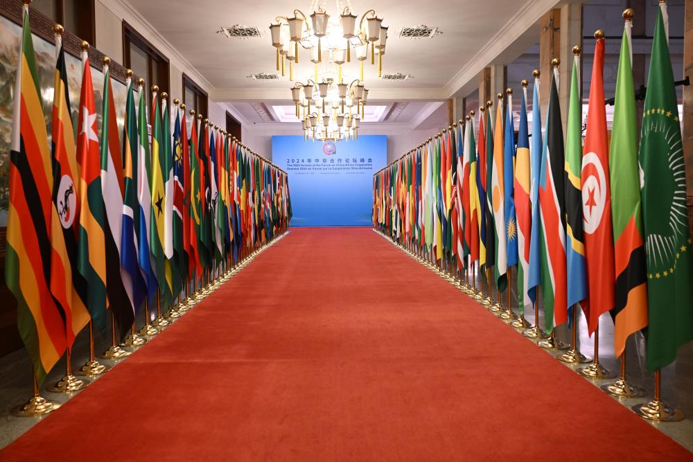 9月5日,北京人民大会堂会场内高朋满座,气氛热烈。中非合作论坛会徽“合抱之手”熠熠生辉,中国国旗和50多面非洲国家国旗以及非洲联盟旗帜组成的旗阵气势恢宏。