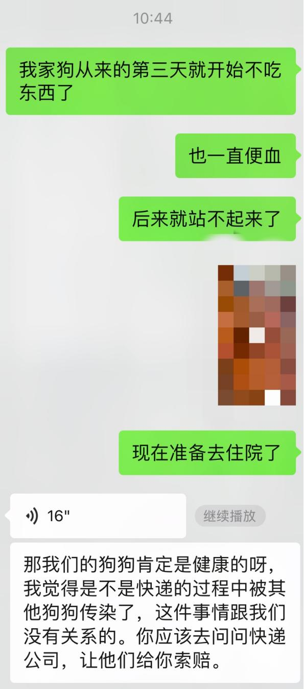 “联系老板讨说法,他却态度蛮横,坚称自己卖的狗是健康的,可能是快递过程中出的问题,让我联系快递公司。”赵秋说,“但快递公司却说他们只负责运输,狗没有签协议走正规程序,所以他们也管不了。”