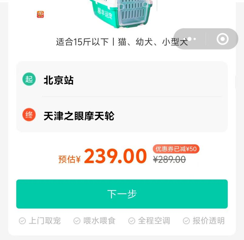 记者在某宠物托运平台查询发现,仅从北京到天津的托运费用就达到 200 多元,是普通快递的十倍多。其中包含了上门取宠、喂水喂食等服务