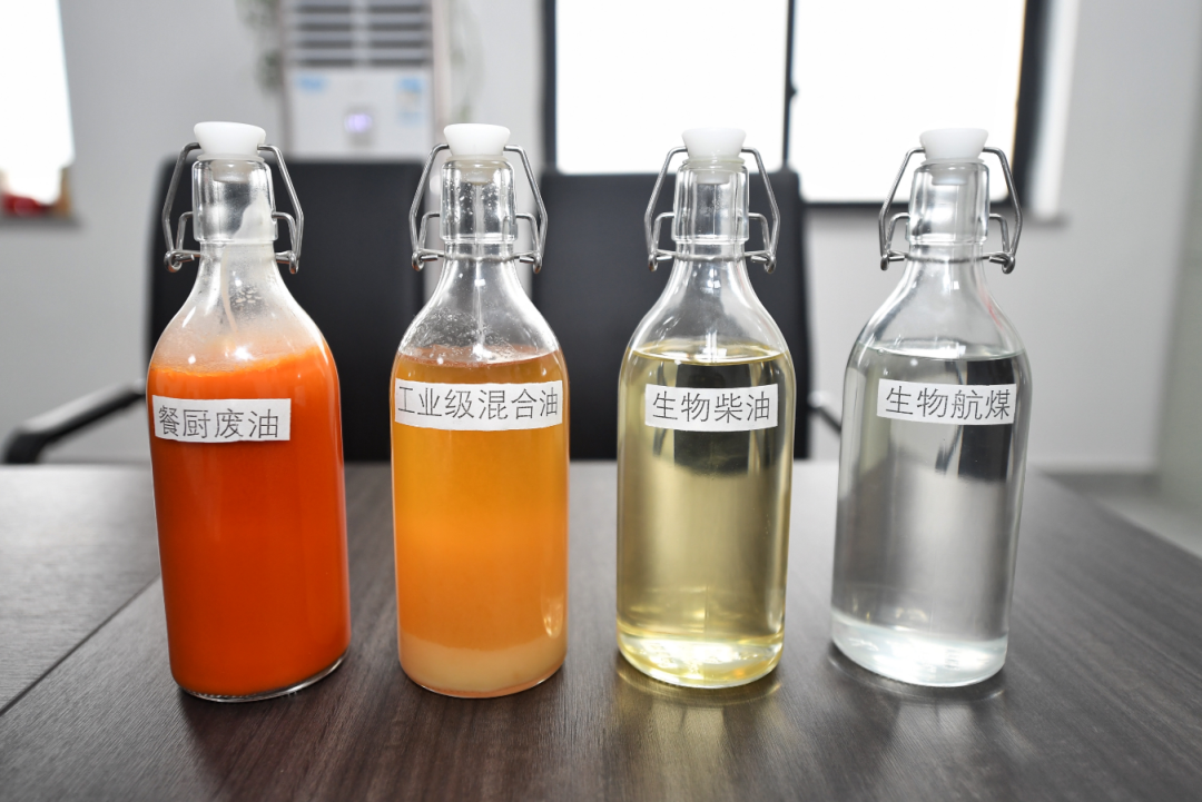 四川一家环保科技有限公司展示的餐厨废油、工业级混合油、生物柴油和生物航空煤油样品。刘坤摄(新华社)