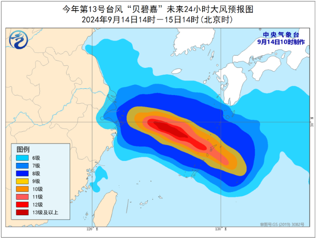 受“贝碧嘉”影响,中央气象台预计,14日14时至15日14时,东海大部海域、浙江东北部沿海、上海沿海、江苏东南部海域将有6级至8级、阵风9级至10级的大风,其中东海北部部分海域将有9级至11级、阵风12级至13级的大风,“贝碧嘉”中心经过的附近海域或地区风力可达12级至13级,阵风14级;浙江东南部、福建东部部分地区有大雨,局地暴雨。