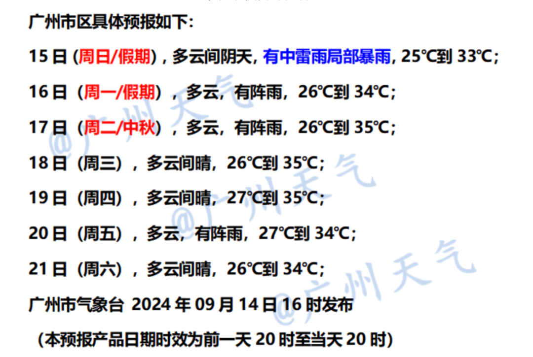 9月16日-17日(中秋假期),副高再次加强,广州以阵雨天气为主,夜间可见月光。