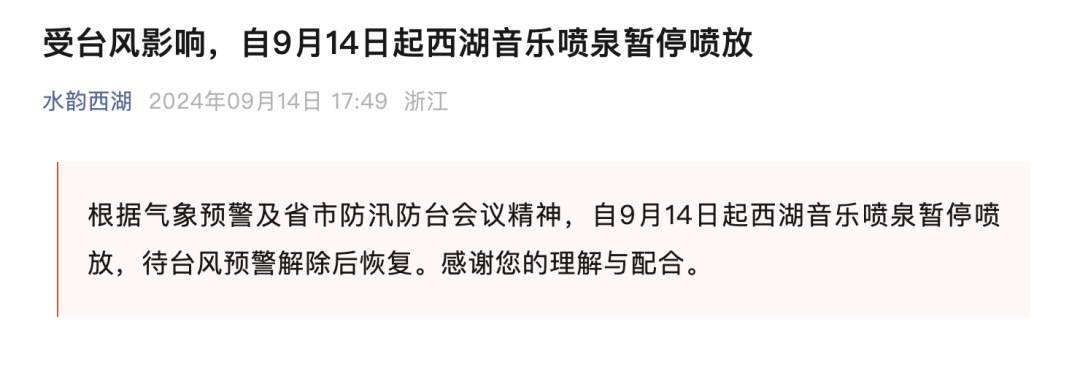 9月14日,水韵西湖微信公号发布通告:自9月14日起西湖音乐喷泉暂停喷放,待台风预警解除后恢复。
