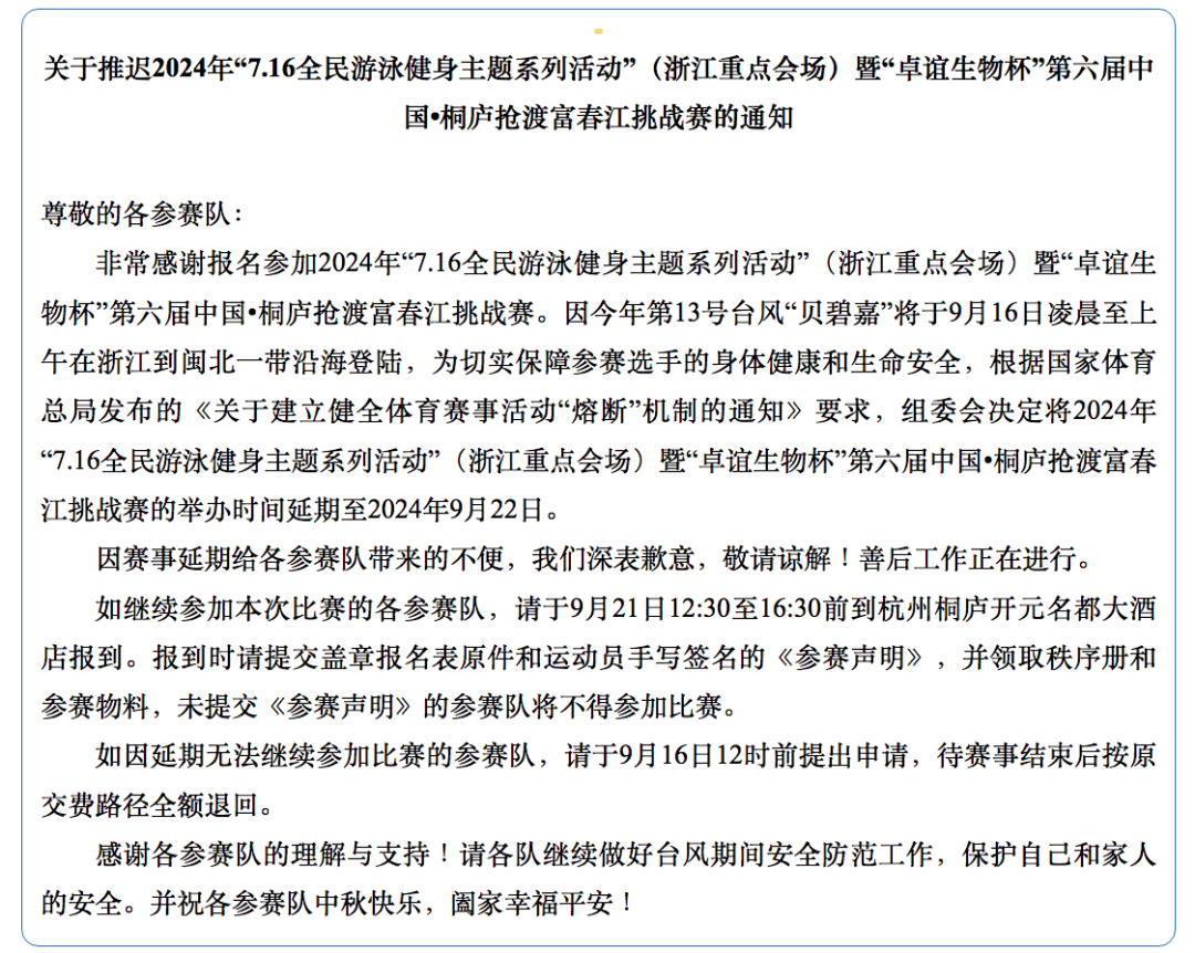 受台风“贝碧嘉”影响,第六届中国·桐庐抢渡富春江挑战赛延期至2024年9月22日举办。
