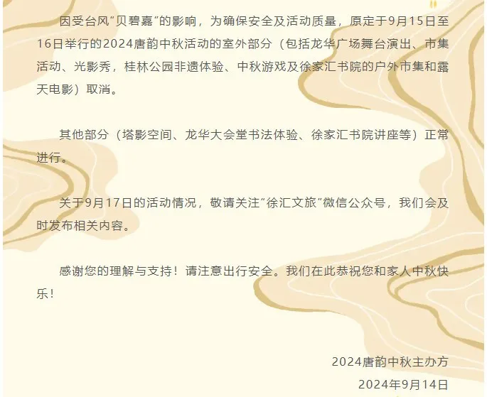 “上海徐汇”微信公众号发布公告,因受台风“贝碧嘉”的影响,为确保安全及活动质量,原定于9月15日至16日举行的2024唐韵中秋活动的室外部分(包括龙华广场舞台演出、市集活动、光影秀,桂林公园非遗体验、中秋游戏及徐家汇书院的户外市集和露天电影)取消。